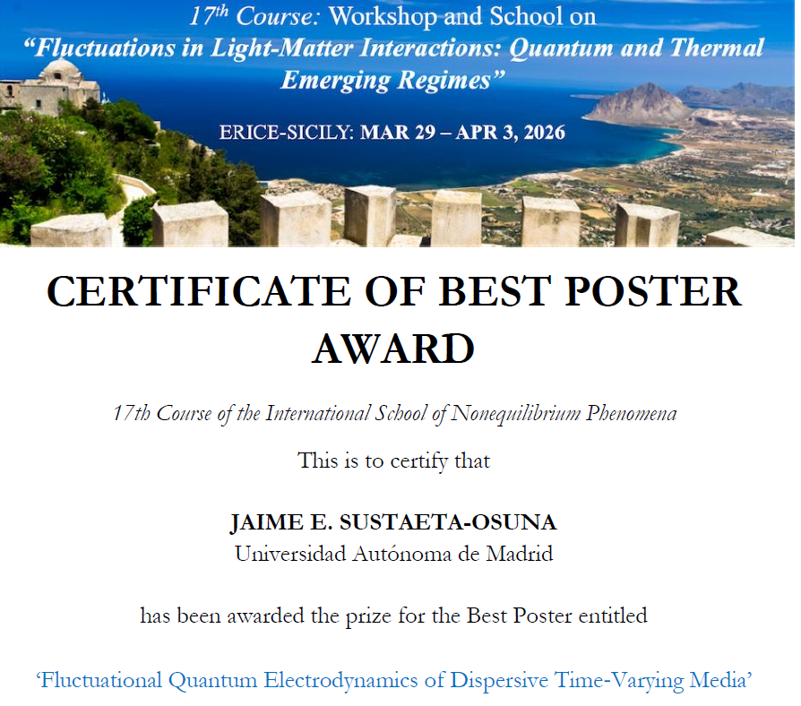 News Jaime wins best poster award at the Fluctuations in Light–Matter Interactions Workshop in Erice! Paloma Arroyo Huidobro 7 April 2026 | Congratulations to Jaime for winning the best poster award! Recommended for You ‘Pasando el Testigo’ with Laura Lobato Capuz and GEMF (RSEF) Laura wins INC Research Award for Physics students and Beca de Colaboración to work with us! Jaime wins 1st Prize in the Student Paper Competition at Metamaterials Conference 2025 Jaime wins best poster award at the CEN 2025 conference