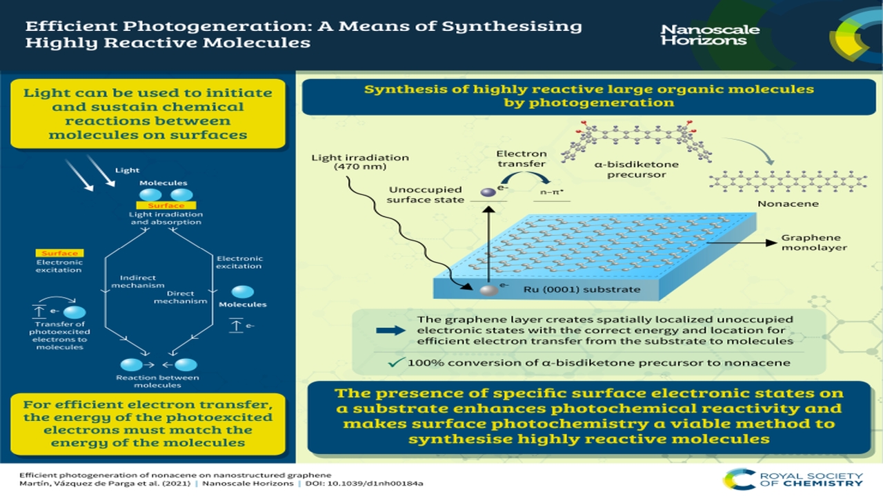 In the 90’s a theoretical study proposed the idea that the existence of surface localized photoelectrons can be relevant for on-surface photochemistry of diatomic molecules. In this work we show that the same idea is extensible to long chain molecules where the affinity levels of the molecules are more delocalized. We focus our study on long-chain acenes due to their interesting electronic properties. These molecules have been proposed for carbon-based spintronics or electronic applications for their semiconductor properties. In general, they are difficult to synthesize due to their low solubility and high reactivity. We have deposited a-bisdiketone precursors on graphene grown epitaxially on Ru(0001). The interaction between graphene and Ru(0001) creates a surface resonance that coincides in energy with the n–p* transition of the diketone group. The photoelectrons produced on the Ru(0001) substrate exposed to visible light populate the surface state and are easily transferred by inelastic scattering to the affinity levels of the precursors. The conversion yield is much higher than in other substrates that do not present an unoccupied surface state. These results allow the design of surfaces to improve the efficiency in photochemistry processes, opening the door to the efficient synthesis of complex molecules on surfaces. [full article]